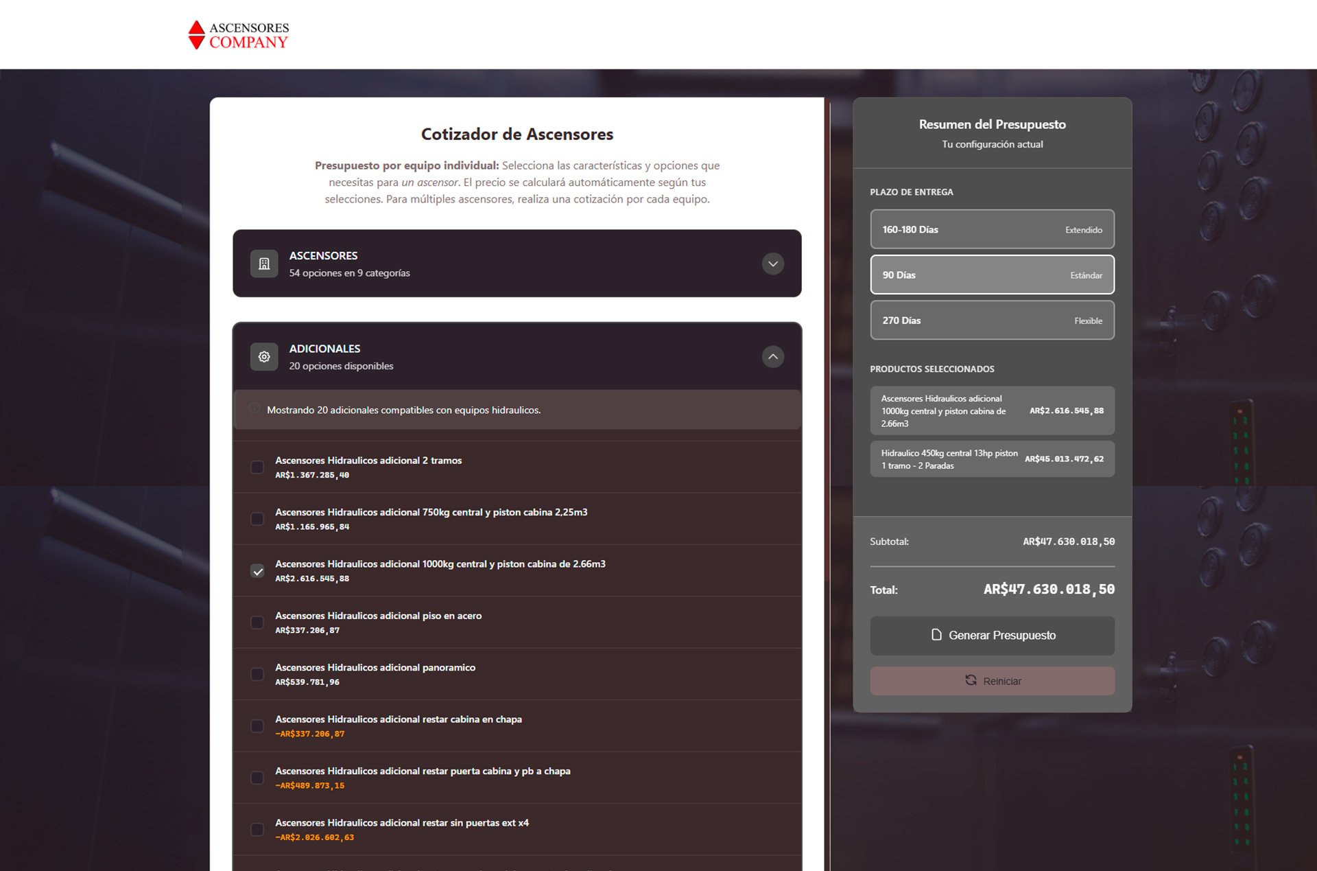 Obtener el precio final automático, teniendo en cuenta modelo, adicionales y condiciones activas como plazos de entrega o descuentos.